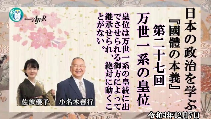 日本の政治を学ぶ『國體の本義』第27回「万世一系ー我が国においては、皇位は万世一系の皇統に出でさせられる御方によって継承せられ、絶対に動くことがない。」小名木善行&佐波優子 AJER2022.12.7(3)