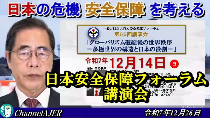 「(一財)日本安全保障フォーラム講演会ー『グローバリズム破綻後の世界秩序ー多極世界の構造と日本の役割』後編-①」矢野義昭 AJER2025.12.26(1-1)