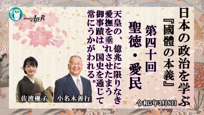 『國體の本義』第40回「聖徳・愛民ー天皇の、億兆に限りなき愛撫を垂れさせたまう御事蹟は、国史を通じて常にうかがわれる。」小名木善行&佐波優子AJER2023.3.8(3)