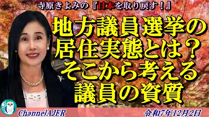 寺原きよみの『日本を取り戻す!』第126回「地方議員選挙の居住実態とは?そこから考える議員の資質(前半)」寺原きよみ AJER2025.12.2(1)